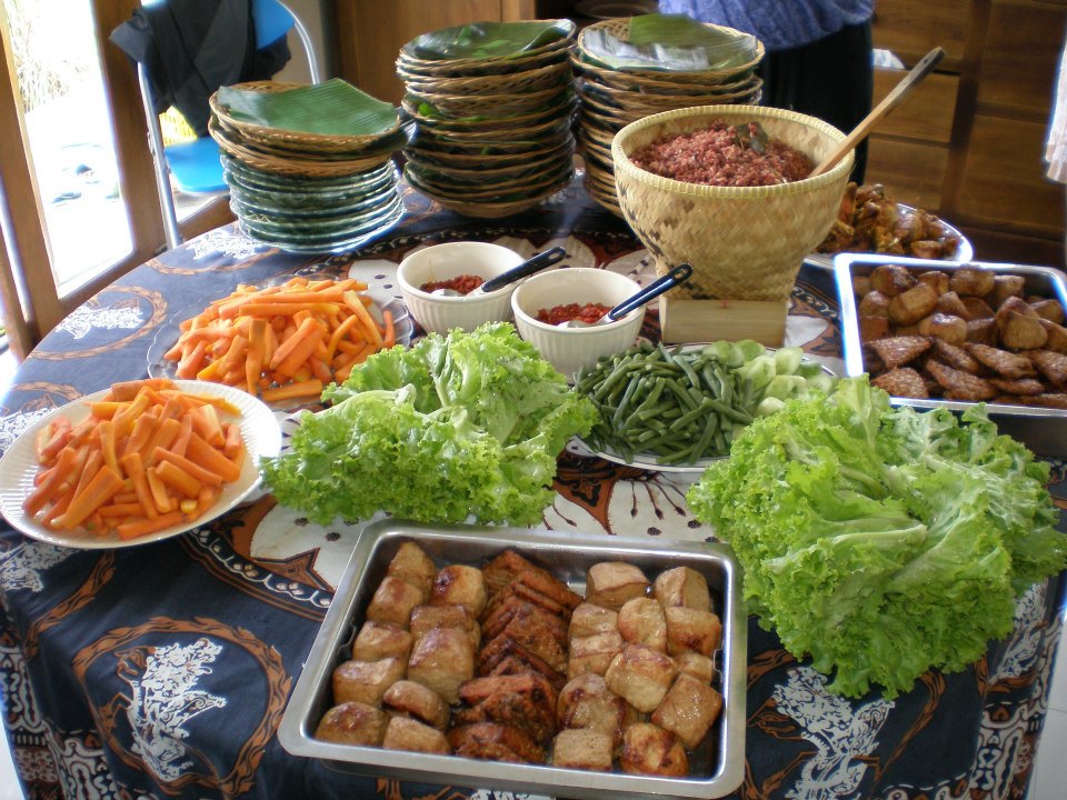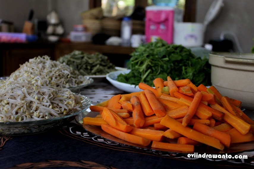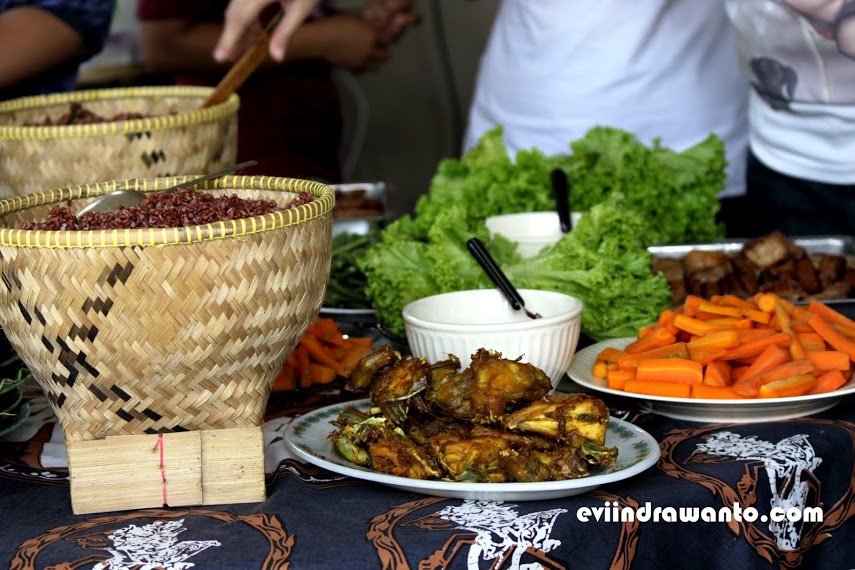 Balik dari kebun makan siang sudah menanti. Mata langsung saja dimanjakan warna-warni ngejreng alami diatas meja. Para juru potret pun langsung riuh untuk beraksi. Membidik kesana-kemari sebelum makanan itu tandas sambil memperbincangkan kearifan yang terkandung di dalamnya. Tentu saja faktor sehat dan rasa jadi topik nomor satu. Dan saya tanpa ragu melahap nasi dari beras merah organik, goreng ayam, ditemani sayuran dan urap dari kebun organik sadaya farm sendiri. Sedap euy!