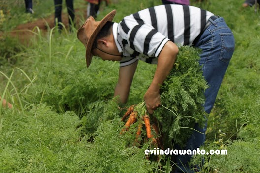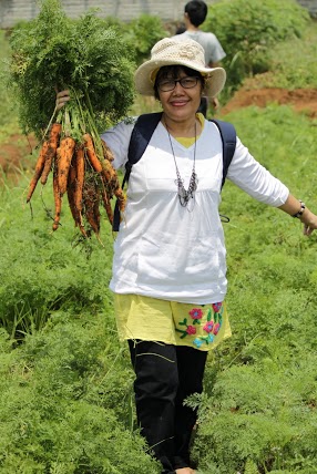 Nah tentu saja peserta yang rata-rata adalah konsumen organik boleh belanja sayur yang sudah bisa dipanen. Jadi deh saya yang tidak suka bertanam tapi suka memetik memuaskan hasrat. Panen wortel, lobak dan terung ungu dengan sangat antusias. Kalau saja sayur-mayur itu bisa lama disimpan di kulkas, kayaknya mau deh belanja untuk sebulan 🙂