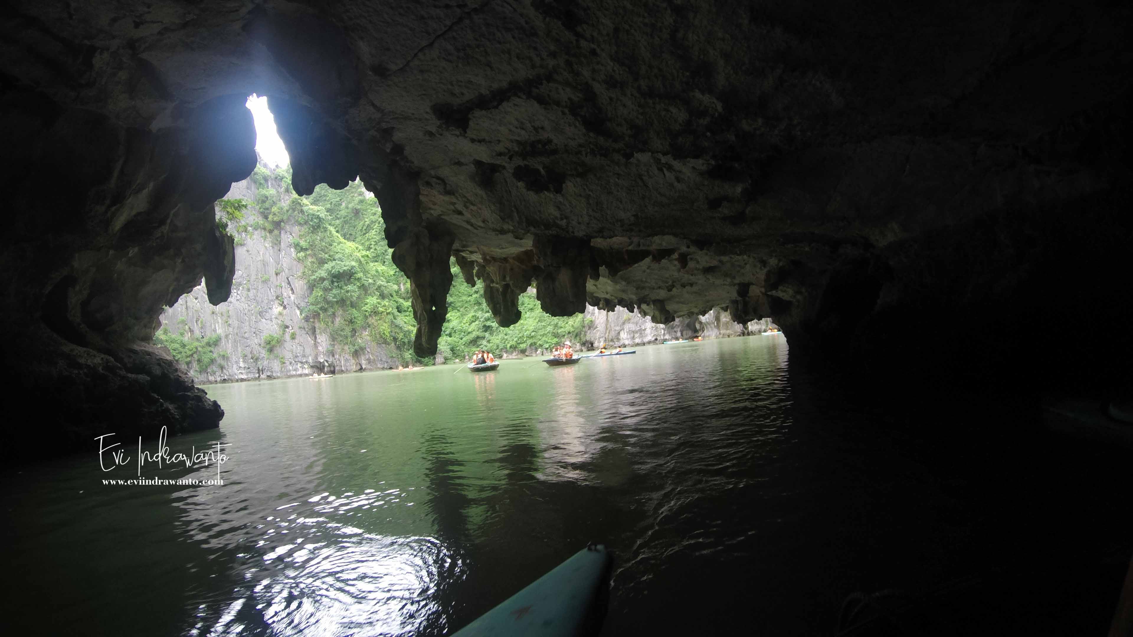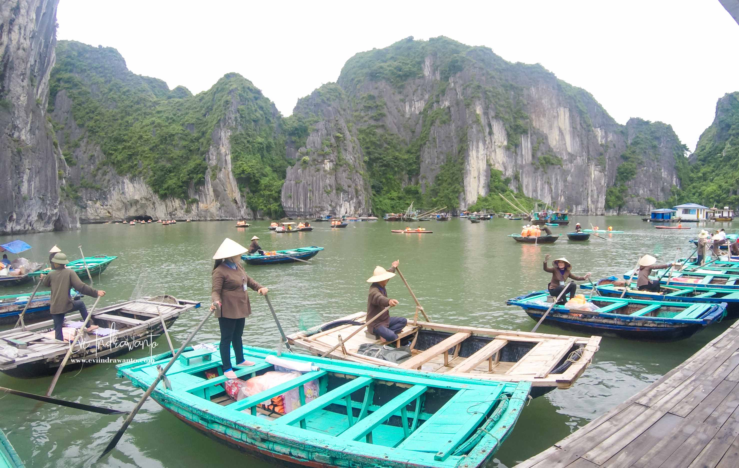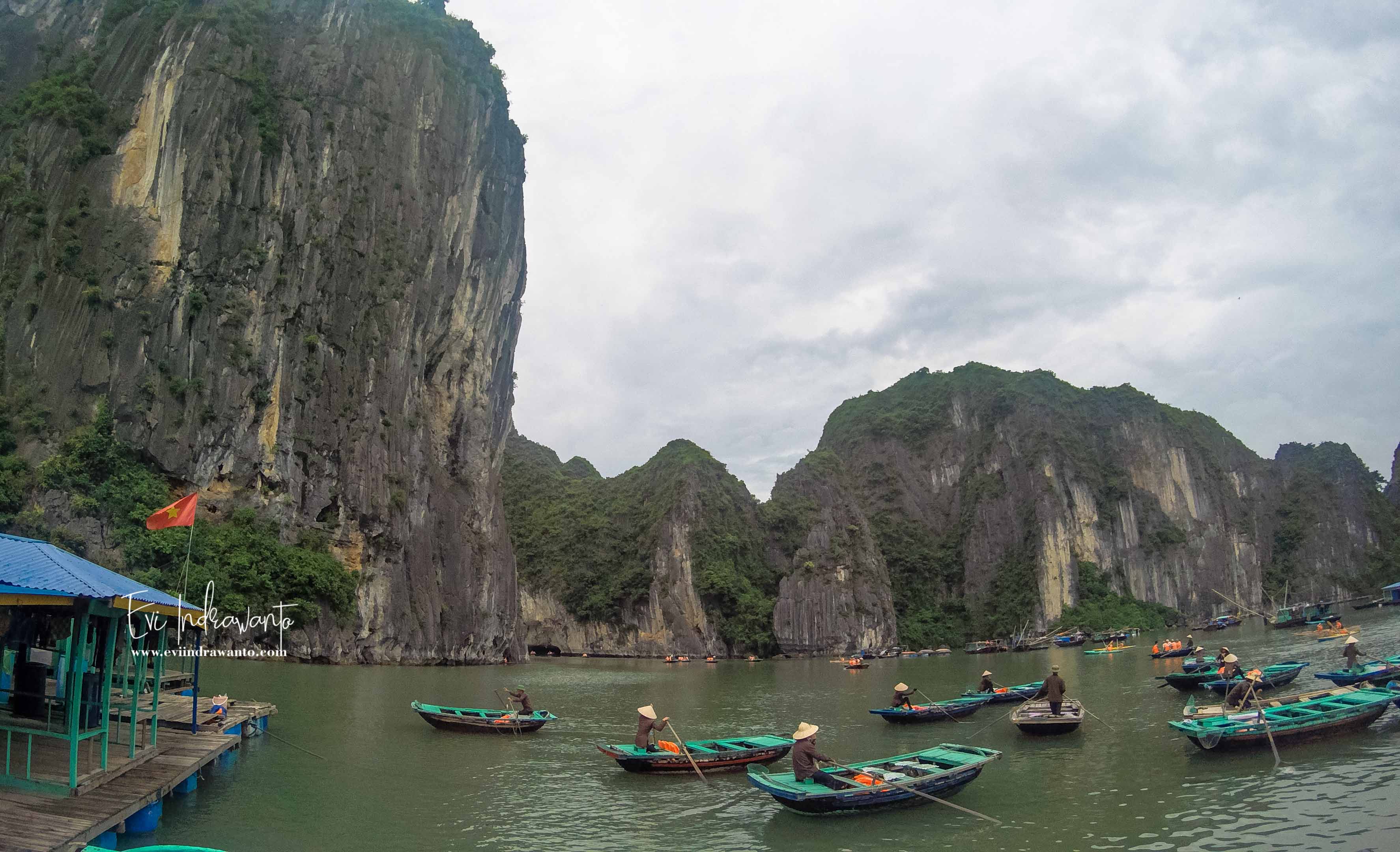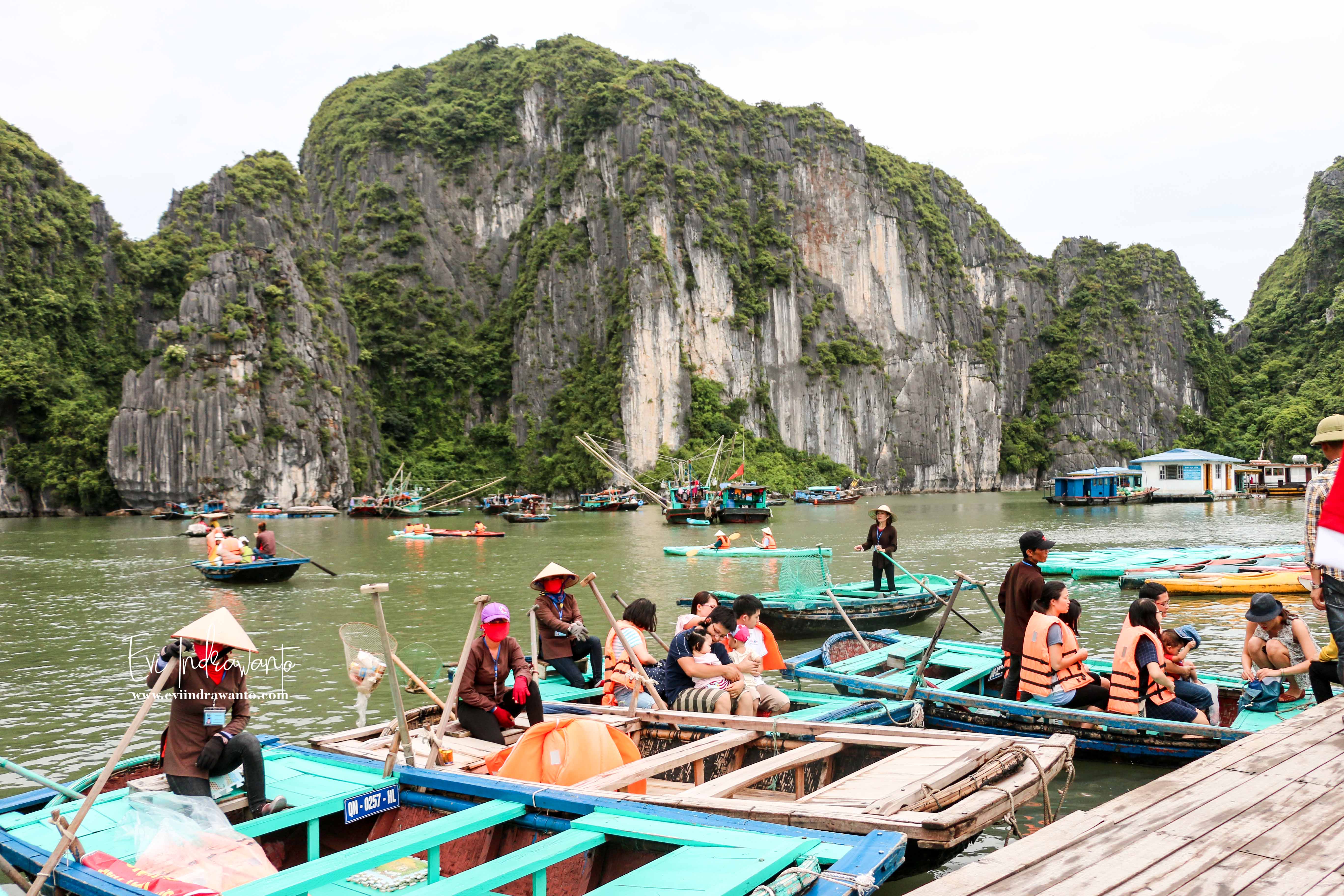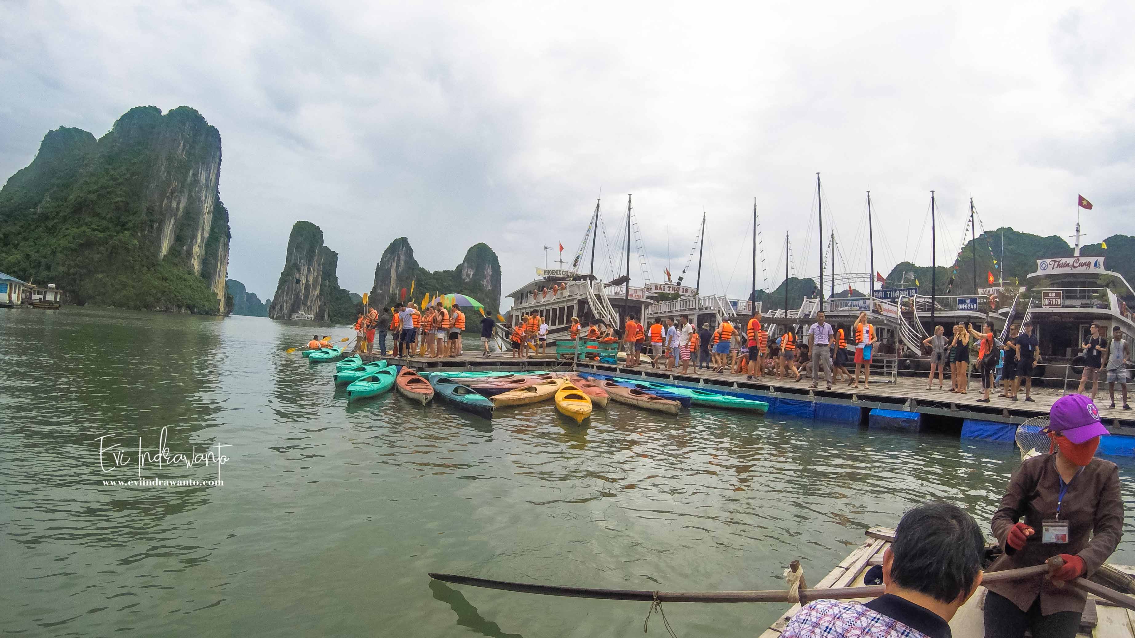 Kembali ke kapal, Halong Bay Cruise Vietnam di lanjutkan untuk berperahu menuju Danau dengan melewati gua. Hari itu Halong Bay sangat ramai. Begitu tiba kKapal kapal pesiar sudah berbaris membentuk kerumunan. Kami turun ke ponton, lalu mendarat di dermaga yang terbuat dari papan.