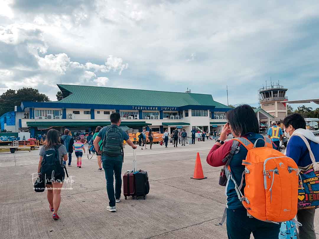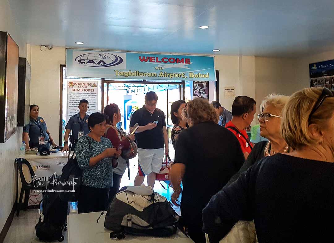 Tapi saat saya menggunakan penerbangan Tagbilaran Airport masih digunakan. Bandara kelas 2 yang mirip bandara bandara di pelosok Indonesia. Pekerjaan memindahkan bagasi dari perut pesawat dilakukan masih manual. Koper koper di bawa turun dari pesawat dengan diangkat satu persatu lalu diangkut gerobak. Didorong pakai tenaga manusia. Di masukkan ke sebuah lubang ban berjalan. Kita bisa melihat koper kita sejak dari lambung pesawat sampai masuk ban berjalan.